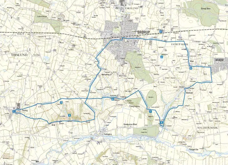 Cykelrute 1 Føvling - Brørup. Billedet viser ruten på 27 kilometer, der går gennem Føvling, Brørup, mod Askov og til Folding.
