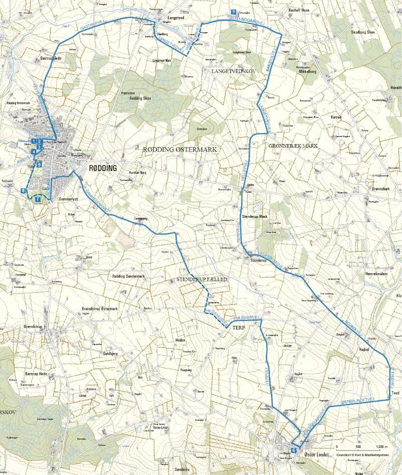 Cykelrute 10 Øster Lindet - Rødding. Billedet viser ruten på 36 kilometer, der går gennem Rødding, over Langetved, Øster Lindet og tilbage til Rødding.