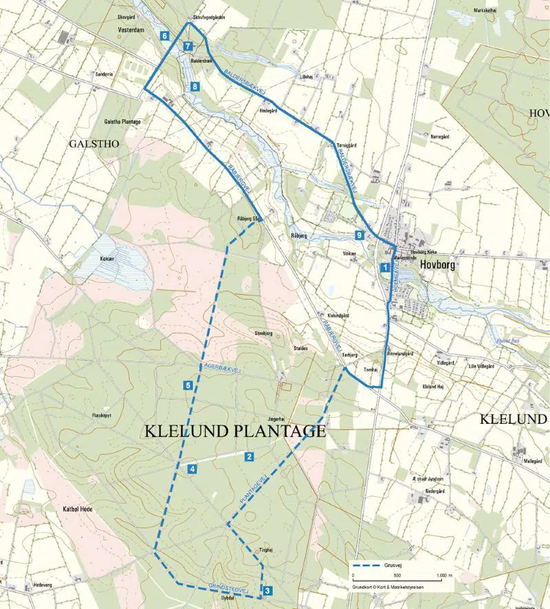 Tag på en 17 kilometer lang rute fra Hovborg til Klelund Plantage, Baldersbæk Plantage og tilbage til Hovborg.