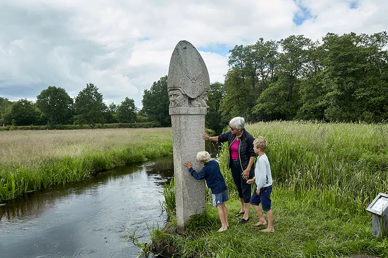 Lige ved åbredden neden for Baldersbæk står en cirka tre meter høj granitskulptur med tre ansigter udført af billedhugger Anders Bundgaard, opsat på det sted, hvor tre herreder støder sammen. Herreder var en tidligere inddeling af landet.