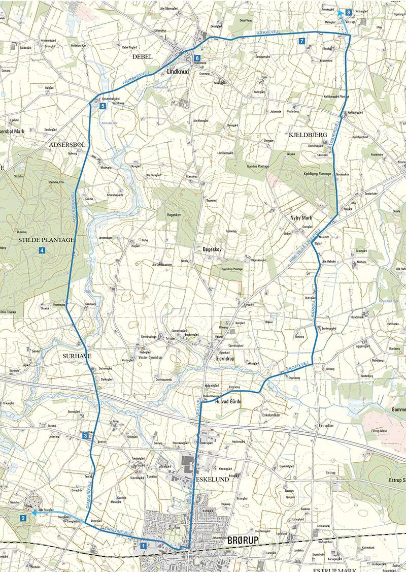 Cykelrute 2 Brørup - Nord. Billedet viser ruten på 27 kilometer, som går gennem Brørup, Stilde Plantage, Lindknud og tilbage til Brørup.