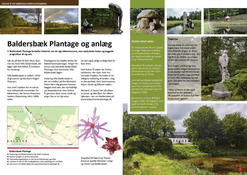 Omkring Villa Baldersbæk er der en rundtur på fire kilometer. Ruten fører dig gennem haveanlægget med søer, der oprindeligt var karpedamme, over Holme Å, gennem skov, mose, hede og enge. Her er en rig natur.