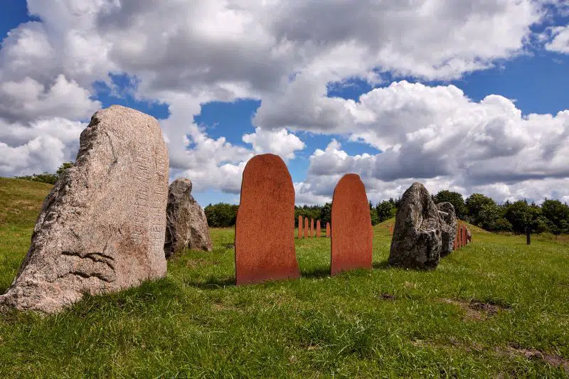 Her hvor Kyst til Kyst Stien krydser Hærvejsruten finder du et af Danmarks vigtigste oldtidsminder. For cirka 3000 år siden, i bronzealderen, blev der her anlagt to gravhøje, der senere i vikingetiden blev udvidet med en 45 meter lang skibssætning.