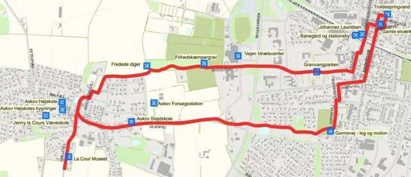 En 7 kilometer lang rute, hvor du oplever Askovs højskolehistorie og Vejens industrihistorie.