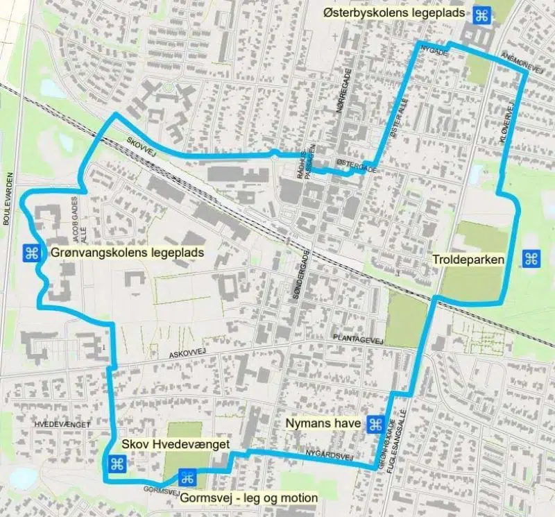 En rundtur til parker og legepladser, hvor leg, bevægelse og frisk luft kan kombineres. Undervejs møder du både motionsredskaber, bålhytter, siddepladser, stille skovområder og livlige legepladser. Du er velkommen på skolernes legepladser uden for institutionernes åbningstid.