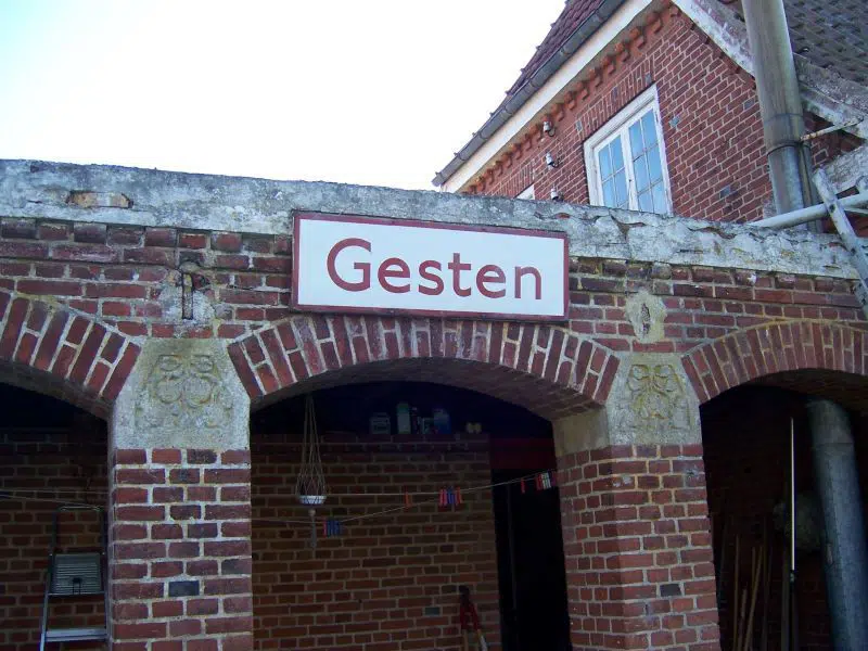 På vej mod øst ad Tranestien, eller Troldhedestien, som den kaldes i folkemunde, passerer man den gamle stationsbygning. Gesten-skiltet hænger der stadig. Stien følger den nedlagte banes spor – med byen til højre og til venstre med udsigt ud over Gesten Kær.