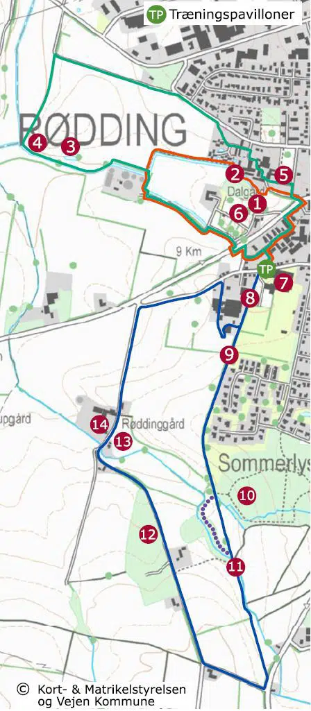 Tag på en af tre ruter på knap to, godt tre eller godt fire kilometer i Rødding. Her kan du opleve masser af dejlig natur og spændende kulturhistorie. Ruterne starter ved træningspavillonerne, hvor du kan træne styrke, balance og koordination.